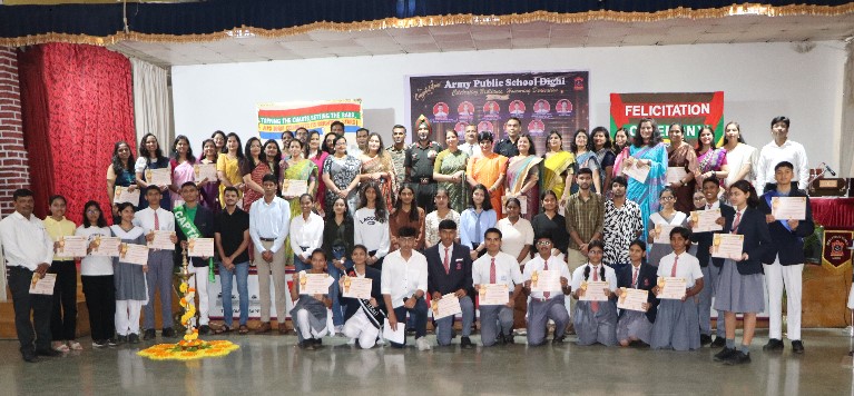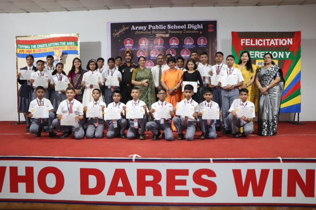 The Investiture and Felicitation Ceremony of Army Public School, Dighi was held on 2nd August 2025 at the CIMT Hall, graced by Brigadier Paramjit Singh Jyoti, VSM, Comdt BEG & Centre, Dr. Rupinder Kaur, Chairperson AWWA and other dignitaries from Trg. battalion – 2. The event featured Lamp Lighting, Saraswati Vandana, a motivational dance, and the Investiture Ceremony, where the new Student Council received their badges. Achievers including APS Dighi Innovators, RD Parade participant – Shivanjali Chauhan of class IX, Academic Toppers of classes X and XII and teachers were honoured. The Chief Guest’s inspiring address and the Principal’s Vote of Thanks concluded the day, making it a celebration of leadership and excellence.
